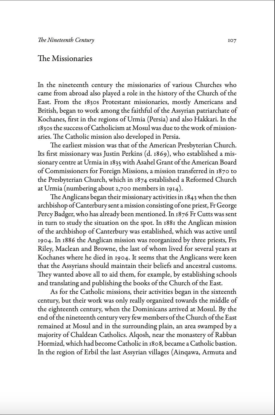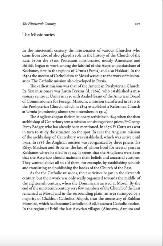 Chaillot highlights the role of missionaries in that modern consolidation: American and British workers operated among the faithful of the patriarchate of Kochanes (Urmia, Hakkari); the Archbishop of Canterbury founded an Anglican mission in 1881, reorganized in 1886 (Riley, Maclean, Browne). Their stated aim was to assist while preserving beliefs and ancestral customs, notably through schools and by translating and publishing the Church of the East’s books. Taken together, her pages indicate that the use and public prominence of “Assyrian” as a church-linked and later political-ethnic identity are modern (19th–20th century) developments. She does not claim that there was no earlier sense of peoplehood; rather, she shows that the label “Assyrian” and its broader, revived scope are recent and were amplified by missionary activity and twentieth-century usage.