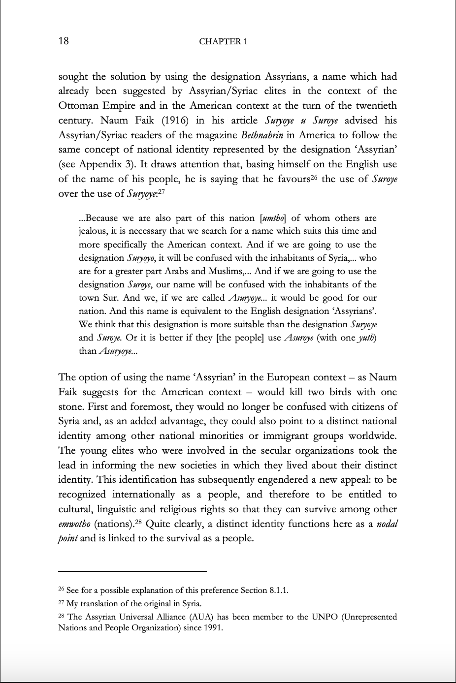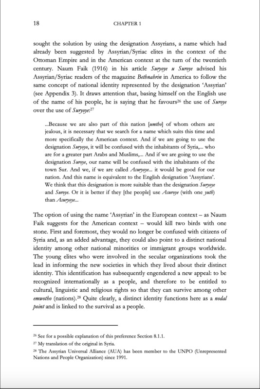 Hostages in the Homeland, Orphans in the Diaspora: Identity Discourses among the Assyrian and Syriac Elites in the European Diaspora, Naures Atto, 2011, pp. 17–18.