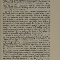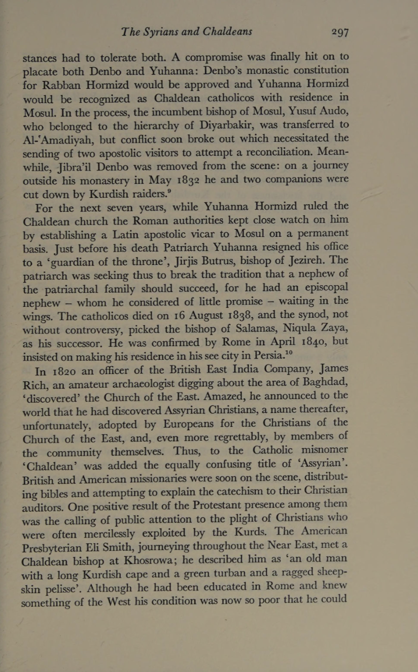 Within that setting, Frazee describes how the ethnonym “Assyrian” entered Western usage. In 1820 James Rich of the British East India Company proclaimed he had discovered “Assyrian Christians,” and Europeans adopted the label for the Church of the East—eventually some community members did so too. Frazee calls this an unfortunate addition to the already misleading Catholic title “Chaldean,” producing a pair of confusing names for related but distinct bodies. He notes the influx of British and American missionaries who distributed Bibles and catechisms and tried to explain doctrine to local audiences. One consequence he judges positive was new public attention to the vulnerability of these Christians to Kurdish depredations. He cites the American Presbyterian Eli Smith’s encounter at Khosrowa with a Chaldean bishop, an elderly man in a long Kurdish cape, green turban, and ragged sheepskin pelisse, whose poverty was striking despite a Roman education and some familiarity with the West.
