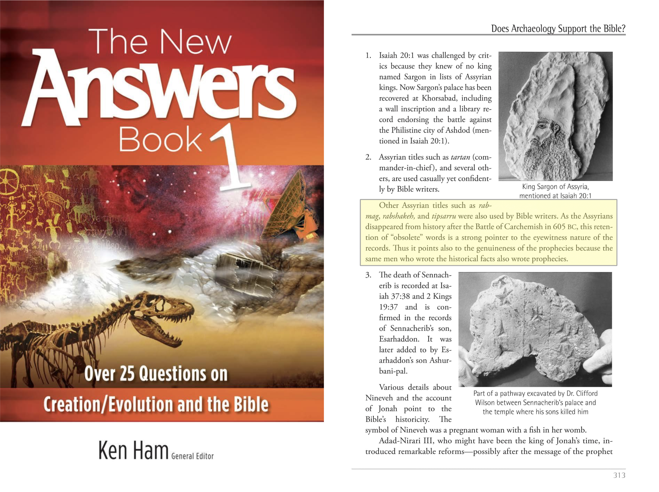 - In The New Answers Book 1 (2006), Ken Ham includes a sidebar titled “Does Archaeology Support the Bible?” that lists historical notes related to Assyria. One point claims that as the Assyrians “disappeared from history after the Battle of Carchemish in 605 BC,” the Bible’s retention of specific Assyrian titles (e.g., rabmag, rabshakeh, tiphsar) supports the texts’ authenticity, since such “obsolete” terms would have been preserved by eyewitness writers.