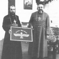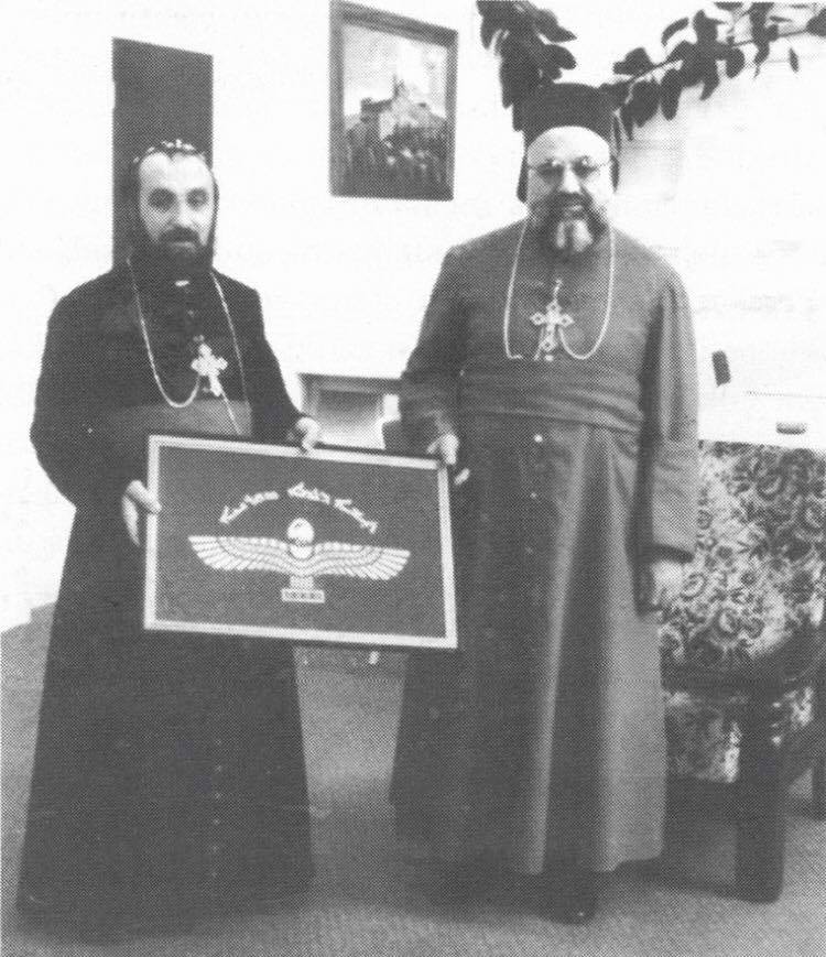 His Holiness Mor Ignatius Zakka I (+2014) – Patriarch of Antioch and All the East, Supreme Head of the Syriac Orthodox Church – together with His Eminence Julius Çiçek (+2005), Metropolitan and former Archbishop of Europe, holding the Syriac-Aramean flag during the inauguration and consecration of the Syriac Monastery of St. Ephrem in the Netherlands, 1984.