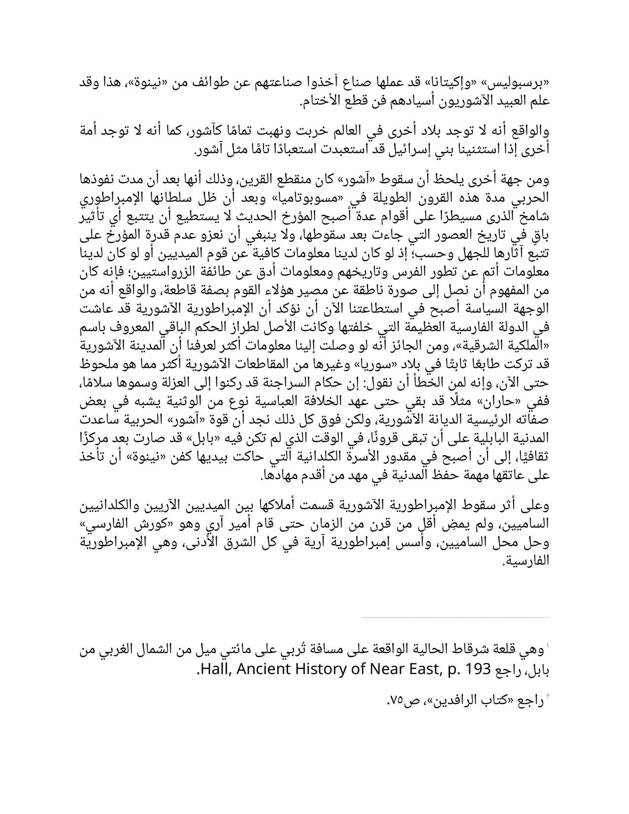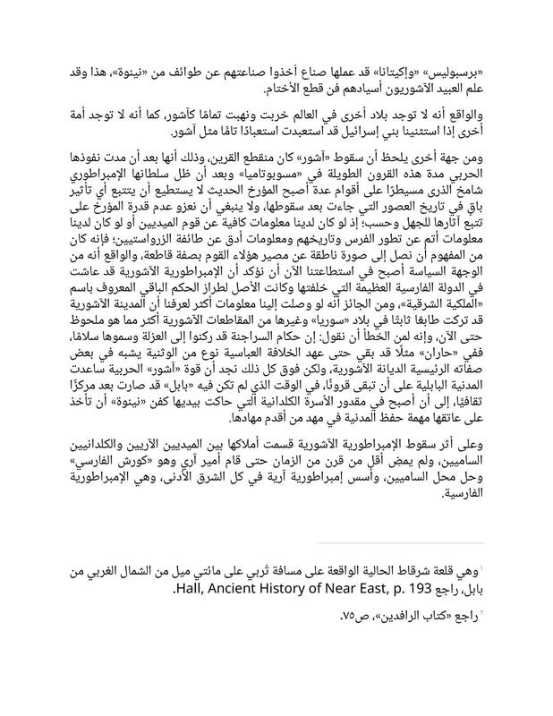 and extended its rule over a vast area, lost its independence. There are two reasons for this phenomenon: First, the Assyrians were immersed in sensual customs that could only lead to the suicide of their lineage, and the last two centuries of their history can be explained by a noticeable decline in their men, but this is not entirely due to internal wars. Second, we know that the Medes had brought a large number of Assyrian craftsmen who worked in metals and stones to their country, and we find many great works of art that were found in the cities of